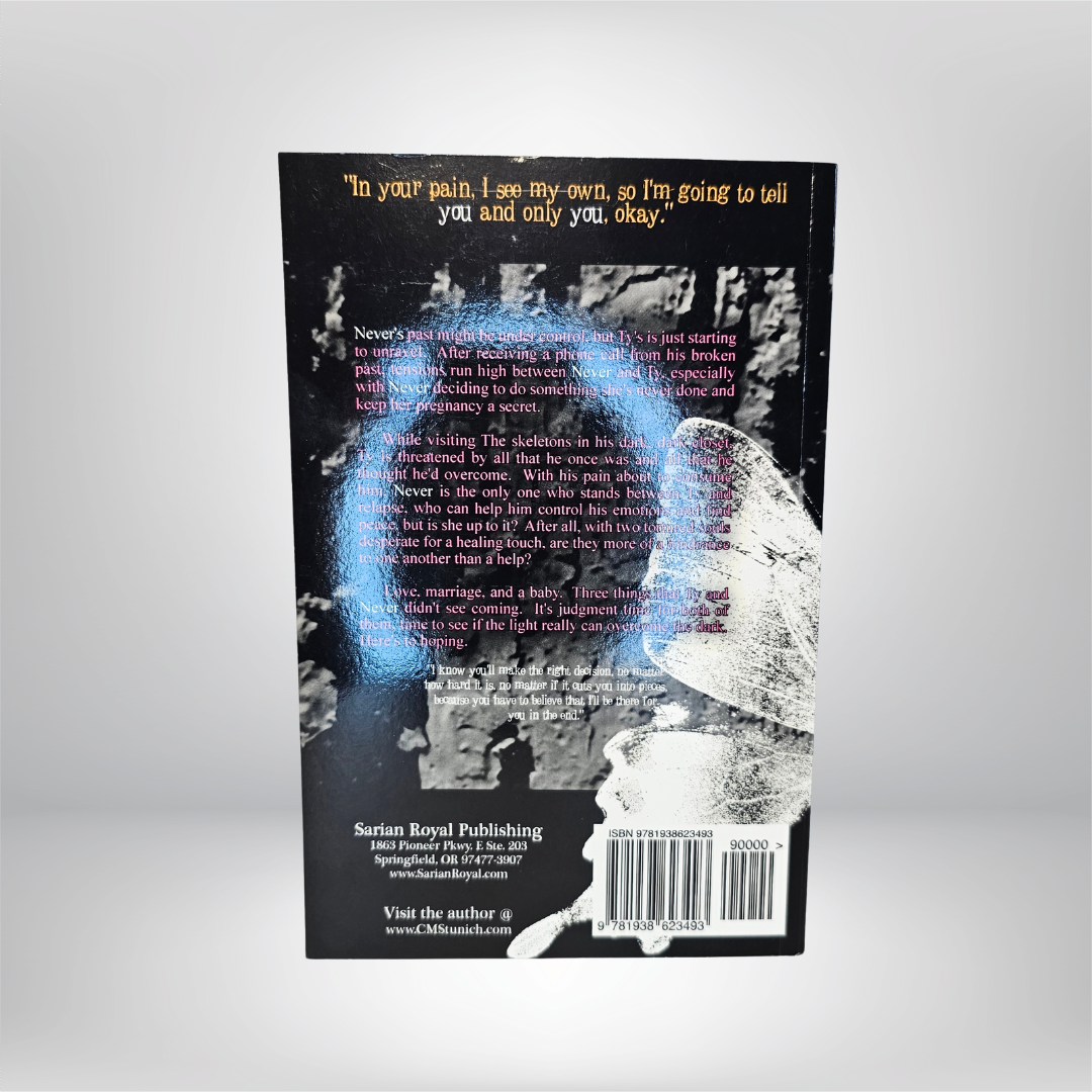 While visiting the skeletons in his dark, dark closet, Ty is threatened by all that he once was and all that he thought he'd overcome. With his pain about to consume him, Never is the only one who stands between Ty and relapse, who can help him control his emotions and find peace, but is she up to it? After all, with two tortured souls desperate for a healing touch, are they more of a hindrance to one another than a help?